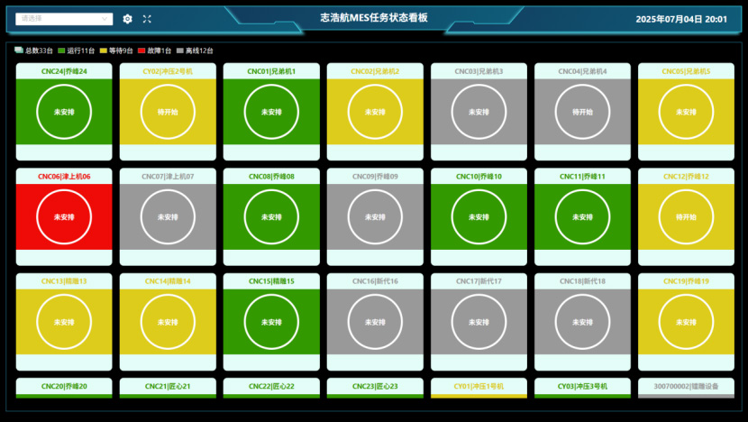动态监控车间设备运行状态、安灯异常报警,并实时展示生产任务总量、工单逾期预警、任务达成率统计及设备OEE班次对比数据;